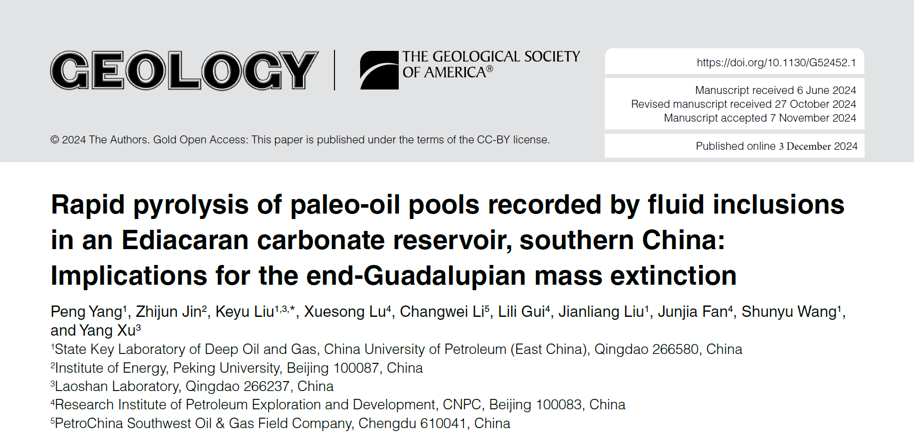 近日,地球科学与技术学院刘可禹教授团队联合北京大学金之钧院士和中石油勘探开发研究院CNPC盆地构造与油气成藏重点实验室等单位在沉积盆地地质流体研究方面取得新进展,相关成果《流体包裹体记录了中国南方埃迪卡拉纪碳酸盐岩储层中古油藏的快速热解:对瓜德鲁普世末期大灭绝的影响》(Rapid pyrolysis of paleo-oil pools recorded by fluid inclusions in an Ediacaran carbonate reservoir, southern China: Implications for the end-Guadalupian mass extinction)发表在地球科学领域国际顶级期刊Geology上。论文第一作者为杨鹏博士后,通讯作者为刘可禹教授;中国石油大学(华东)为第一署名单位,该研究得到国家自然科学基金、中石油科技发展项目、山东省自然科学基金以及中国博士后科学基金项目的联合资助。