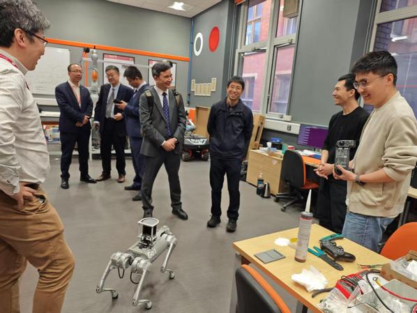 4月29日,代表团与卡迪夫大学工学院院长吴建中教授、卡迪夫中国事务负责人Peng Zhou教授、工学院副院长Alan Kwan教授、工学院国际事务主任Reza Ahmadian教授进行了深入交流。双方充分讨论电气工程、化学化工、机电工程和经济管理等专业领域的合作形式和途径,计划落实外国专家来访、开启科研合作、推动学生互访、搭建联合培养项目等工作,重点探讨两校共同申报中外合作办学机构的可行性。短期居留卡迪夫的中外合作办学法律问题专家、山东建筑大学法学教授吴安新一起参加座谈,提供政策解读和案例分析。大家一致认为,两校具有雄厚的理工科实力和良好的前期合作基础,通过全方位深度合作实现强强联合,必定显著提升双方的教育科研实力和全球学术影响力,后续双方将尽快完成可行性报告并提交校级决策层面。会谈后,吴建中教授陪同代表团参观该校学生学习和实践场所、机器人实验室、氨能实验室、转化研究中心(TRH)催化及零排放实验室等科研创新机构。代表团还看望了在卡迪夫大学工作的校友、玛丽居里学者林栋博士,鼓励他为两校合作多做贡献,为石大发展推荐优秀人才。