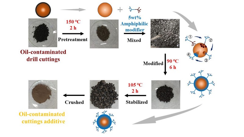随着非常规页岩油气等资源的大规模开发,钻井过程中产生的大量岩屑被含油有机物、钻井添加剂和无机盐等复杂混合物污染,形成的油基钻屑对环境构成重大挑战,并被列入我国危险废物清单(代号HW08)。传统高温热解处理方法存在能耗高(处理温度500-800℃)、二次污染风险大(尾气VOCs和二噁英超标)和资源利用率低等突出问题。基于可持续发展理念,研究团队开发了一种简洁、低投资且低污染的处理新技术,实现了油基钻屑的资源化和减量化,推动构建了原位治理的绿色循环。