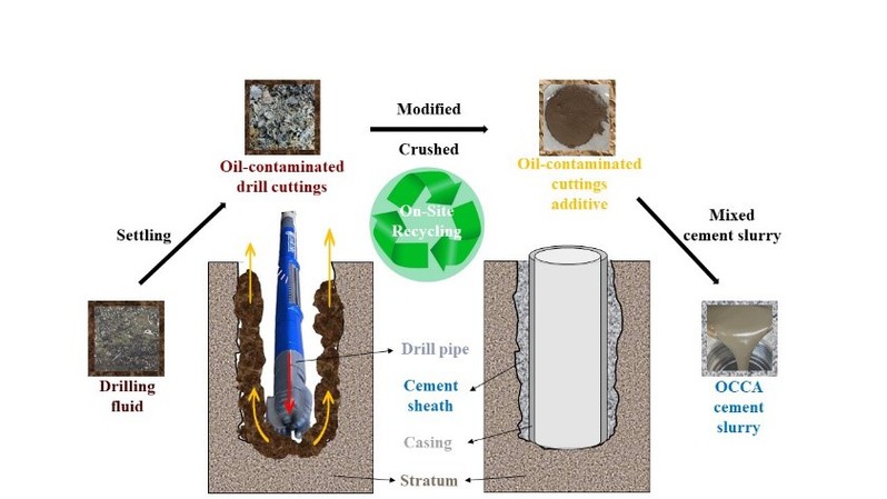 本研究提出的低温原位改性技术通过“油水分离-表面改性-性能调控”三步法,成功在污染源原地完成废物治理,并突破性地使高掺量(40%)改性油基钻屑通过固井返回地层,实现废物循环和资源化利用。相较于传统工艺,低温和现场原位处理显著降低了设备和能耗成本,同时消除了运输环节并部分替代油井水泥材料以进一步降低费用。改性后的油基钻屑作为固井外掺料返回到地层,不仅满足固井施工和井筒封固性能要求,而且无有害物渗漏和地下水污染风险,并成功进行了现场施工试验,整个处理流程实现了“污染治理-废物利用-清洁环保”三重效益的统一,为非常规页岩油气等开发所产生的大宗量油基钻屑危险废物资源化管理和绿色油田建设提供了可推广的新方案。
