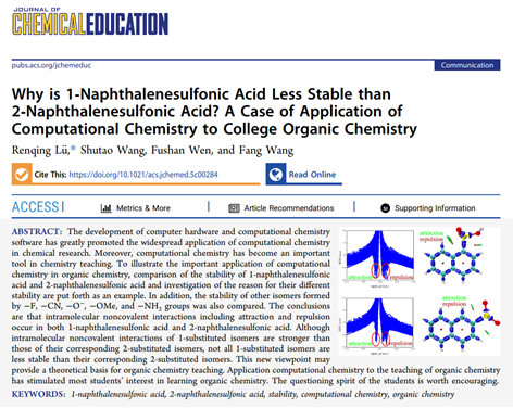 近日,美国化学会旗下《Journal of Chemical Education》(JCE)发表了我校化学化工学院化学实验中心吕仁庆等老师的重要教学研究成果“Why is 1-naphthalenesulfonic acid less stable than 2-naphthalenesulfonic acid?- A case of application of computational chemistry to college organic chemistry”(J. Chem. Educ. 2025, DOI:10.1021/acs.jchemed.5c00284)。