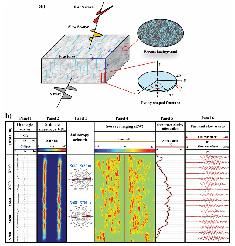 图1.(a)竖直裂缝导致横波分裂示意图;(b)深井声波测量实例