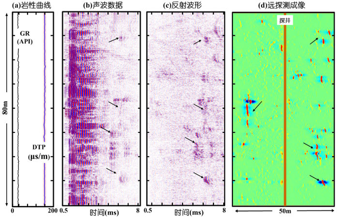如图3,类似于地震反射剖面,这些反射事件(如箭头所示)正是测井声波频段上观测到的高反射率“亮点”,对应良好的反射体成像幅度较高,也呈明显的“亮点”现象。反射体纵向尺度大都在数米左右,为该深层碳酸盐岩中的裂缝型构造,其中分布的裂缝和裂隙提供了天然气的储集空间和运移通道。