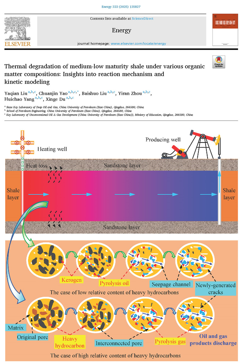 【本站讯】在国家自然科学基金等项目资助下,我校姚传进教授团队在中低熟页岩原位转化开采机理及多相态多场耦合流动模拟研究方面取得系列进展。相关成果先后发表在Chemical Engineering Journal、Energy、Petroleum Science、Fuel等国际顶级权威期刊上,中国石油大学(华东)均为第一通讯单位。